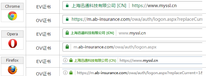 EV證書(shū)因?yàn)槠洳捎昧烁訃?yán)格的驗(yàn)證標(biāo)準(zhǔn),瀏覽器對(duì)EV證書(shū)更加“信任”,當(dāng)瀏覽器訪問(wèn)到EV證書(shū)時(shí),可以在地址欄顯示出公司名稱,并將地址欄變成綠色。